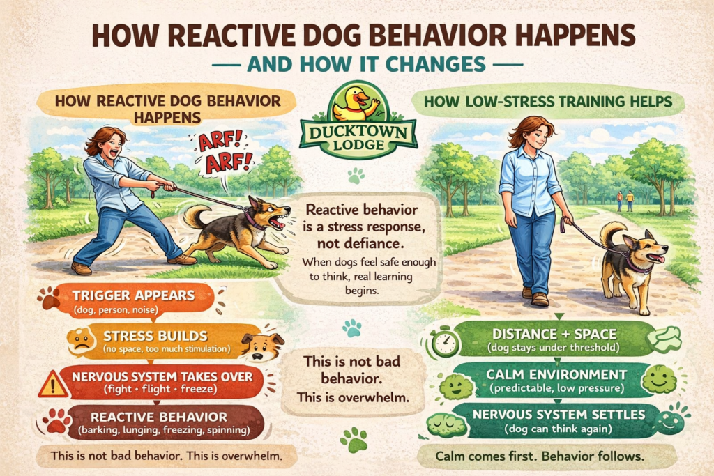 When a dog is over threshold, their nervous system takes control. This visual breaks down the reactive cycle and shows how low-stress training helps dogs settle, focus, and recover faster. Sara York – Ducktown Lodge