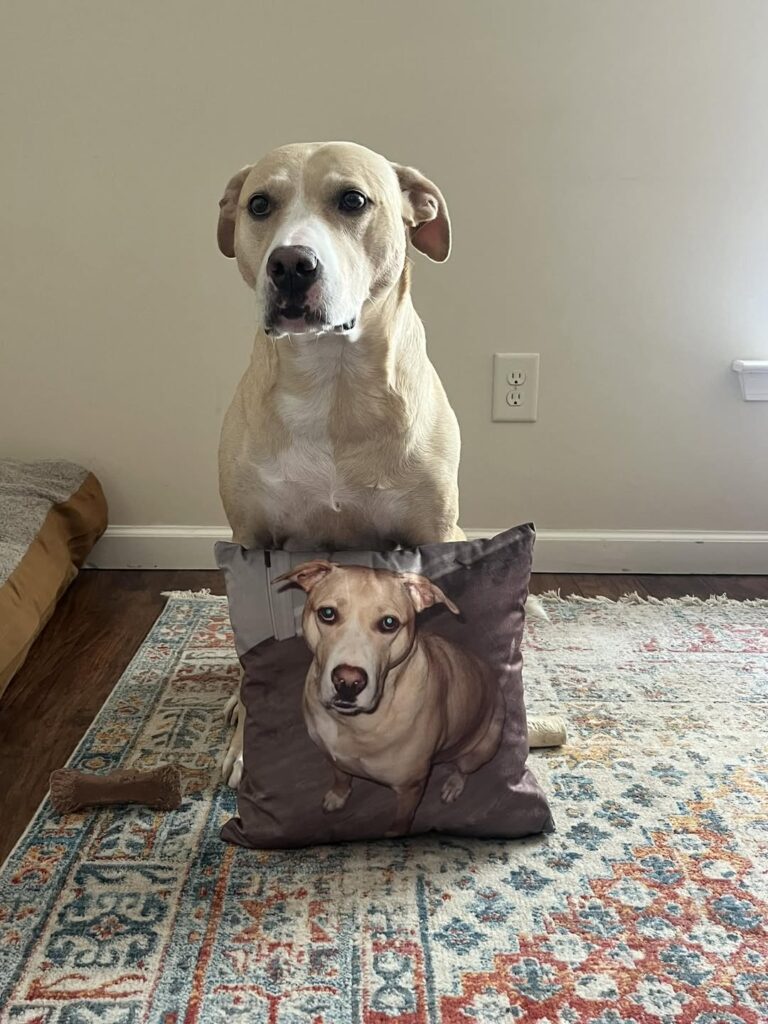 Snickers was adopted through Wags & Wiggles Rescue by Olivia and her husband about a year ago. From the beginning, he brought joy, humor, and affection into their home. He is playful, funny, and deeply bonded to his people.